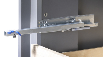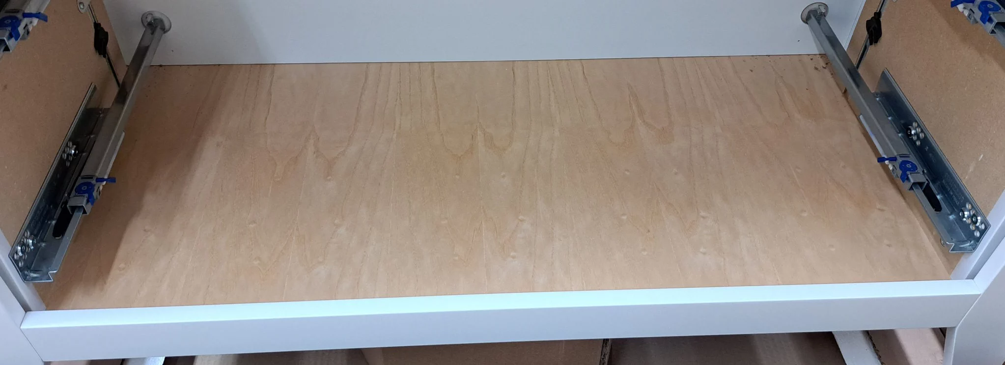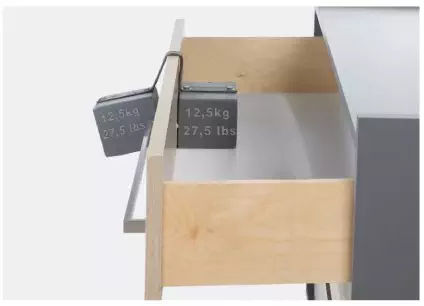 We use commercial grade, adjustable locking drawer glides imported from Europe. These same glides are used in high-end Kitchen cabinets. Slow-motion, Self-closing, Anti-Pinch Drawer Glides with Safety Locks & LIFETIME WARRANTY – drawer cannot be slammed shut. The glides endure a performance test cycle of 100,000 openings & closing with a 75 pound weights placed in the drawer (the equivalent of 90 years of usage).