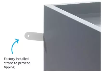 We comply to the voluntary safety standard F2057 for clothing units and provide 2 leather wall anchor safety straps with wall anchors for all furniture units over 30”. When properly installed, these straps should prevent the tipping of furniture if children pull or climb on it.